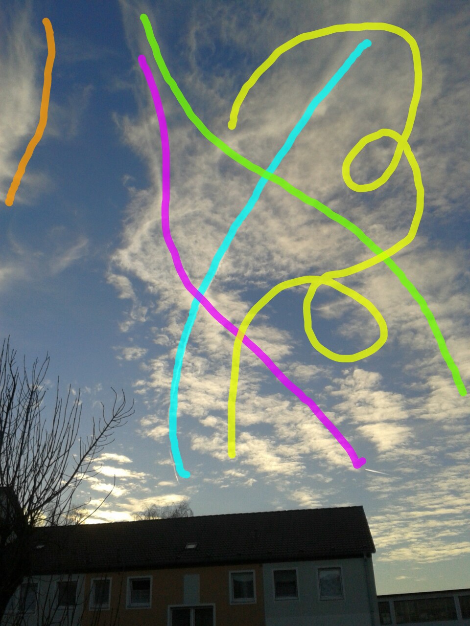 Geht man noch ein paar esothechnische Schritte weiter, so lassen sich neben den regelmäßig und ganz offensichtlich gesprühten Chemikalien zur Kontrolle der Hirntätigkeiten (hellblaue Linie) auch jene Stoffe erkennen, welche das Wetter steuern (orangefarbene Linie), die weibliche Menstruation auslösen (grüne Linie), die sexuelle Orientierung beeinflussen (violette Linie) und BMW-Fahrer von der Benutzung der rechten Spur abhalten (gelbe Linie).