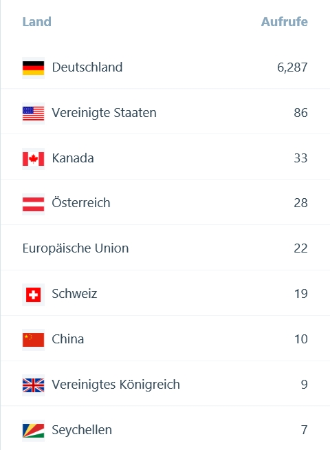 An dieser Stelle wirkt die statistische Auswertung von WordPress auf mich leider etwas unglaubwürdig. Seitenaufrufe aus Österreich und der Schweiz könnte ich mir ja noch irgendwie erklären, mit Müh und Not selbst Nordamerika, aufgrund der Domain .com, aber China!? Die Seychellen!? Dies scheint mir zumindest sehr unwahrscheinlich zu sein.