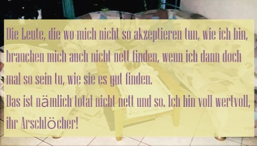 Hinter diesen Profilen verbirgt sich eigentlich immer rührseliger Pathosschrott, subtil wie eine Ballade der Böhsen Onkelz und dabei ähnlich vorhersehbar. Weinerliche Erwachsene, welche sich im Kitsch, mit großem chinesischen Fächer an der Wand über der Couch, daheim fühlen. Hier wird das vermeintliche Außenseitertum mit zwei atü auf dem Kessel und braunen Streifen in der Unterbuxe gepflegt.