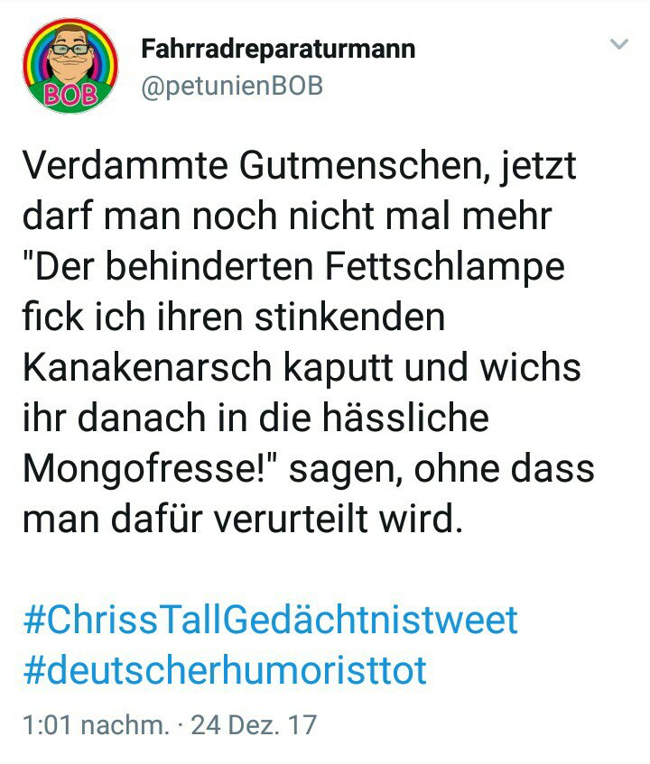 Ärger & Wut, Prädikat: LESENSWERT#metoo 25. Dezember 201715. Januar 2018 BOB Zum Verständnis: Ich kann Chris Tall nicht leiden und selbstverständlich darf man immer noch viele Dinge sagen. Es wäre halt nur irgendwie nett, wenn man sich dabei nicht wie ein komplett rücksichtsloses Arschloch verhält. Bitte. Danke. Gefällt mir Wird geladen …